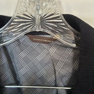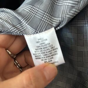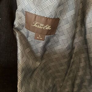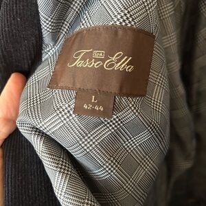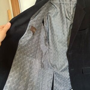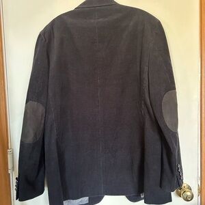 This looks like corduroy navy blue with elbow pads, cotton blend see additional pictures, nice preowned condition no rips, tears or stains. Thanks for looking happy shopping. See pics for measurements