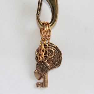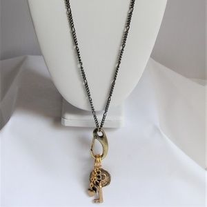 Unique and Interesting Tat 2 Gunmetal Figaro Chain with Brass Carabiner Charm Holder Snap Hook Necklace. Closes with a 24k gold Plate Toggle Hook. Removable Charms Include: Hearts, Key and Coin-all Gold Tone. You’ll have Lots of Fun Changing the Charms or Wearing All 3. Tat 2 Logo on 27” Necklace.