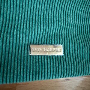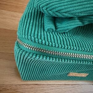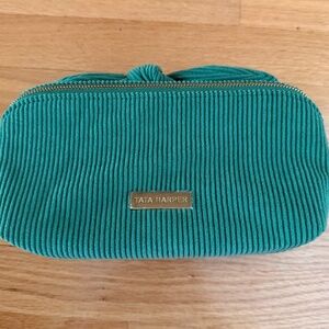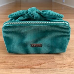 Tata Harper Green Corduroy Cosmetic Jewelry Tote NWOT. Bright kelly green corduroy tote with a twist bow handle. Gold tone zipper with branded zipper pull on the diagonal. Protective plastic coating on the pull and front Tata Harper plate. Five accordian style sections on the interior with one back side zipper pocket. Two slip pockets on the divider of the first section. Color most accurate in pics 6-8. Excellent, new condition.
