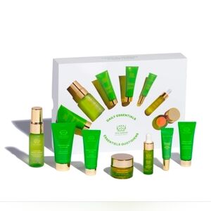 Set of three Tata Harper Resurfacing Serums. Bright green tubes with elegant gold caps. Perfect for skincare routine.