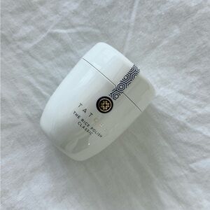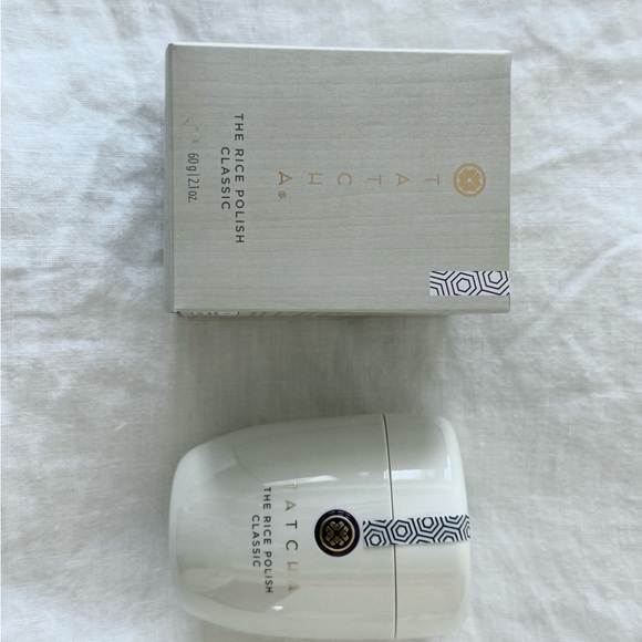 Elegant Tatcha Rice Polish in sleek white container. Accented with gold details. Ideal for skincare lovers.