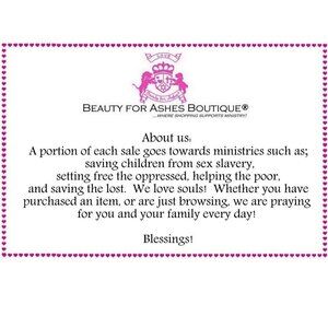 Please note: Beauty for Ashes Boutique carries t-shirts, worship flags, clothing, jewelry and accessories; many with our trademark brand name 'Beauty for Ashes' - which means God will restore Beauty in place of life's ashes - Isaiah 61:3. None of our items carry literal ashes. Instead, our items carry the blessings of God representing restoration and divine destiny for each individual.