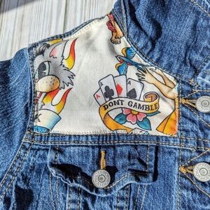 Tattoo Flash Forever Custom Made Denim Jean Jacket in Blue and Cream Size 6