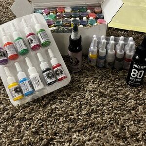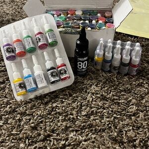Comprehensive tattoo kit featuring a variety of colorful inks and a beginner's guide. Includes essential tools and accessories.