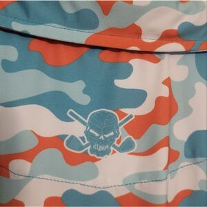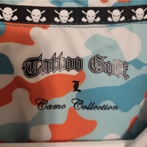 The Blue & Orange Camo Golf Polo is designed for both performance and style. It features a tag-free label for extra comfort, a 3-button placket for adjustable fit, and a full sublimation print that ensures vibrant color and lasting durability. The skull design on the back adds a signature Tattoo Golf touch, completing the edgy look.
