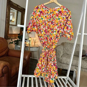 vibrant Tatulah floral dress in size Medium. The colorful floral pattern is perfect for any occasion, and the lightweight fabric makes it super comfortable. It comes with a matching belt. Great for a summer day out or a casual get-together!