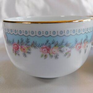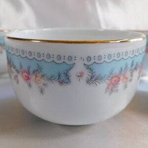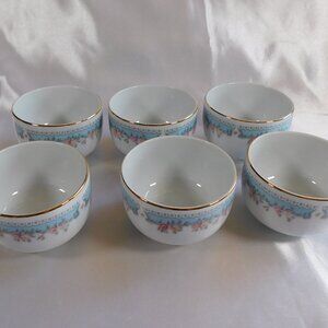 This is a set of six bowls by Tatung of Taiwan. They can be used for rice, saki, or a sauce or dessert bowl. They are white with a blue band and pink flowers and silver rims.