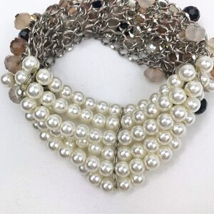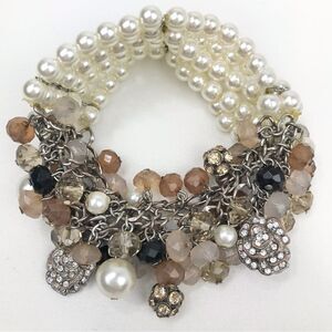 Taupe Blush Bead Rhinestone White Pearl Multi Strand Dangle Stretch Bracelet