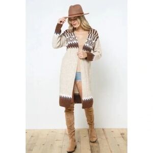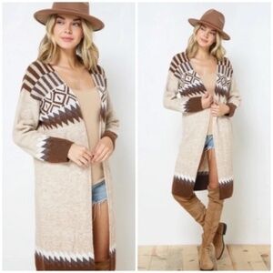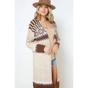 Taupe & Brown Aztec Tribal Western Boho Long Open Knit Cardigan Casual Sweater