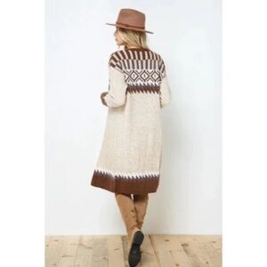 Featuring our taupe and brown bohemian aztec tribal printed longer length knit cardigan sweater. Long sleeves.