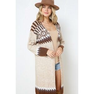 Taupe & Brown Aztec Tribal Western Boho Long Open Knit Cardigan Casual Sweater