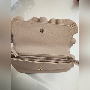 This chic taupe clutch features a stylish ruffle design and stripped interior. This bag is perfect for any occasion.
