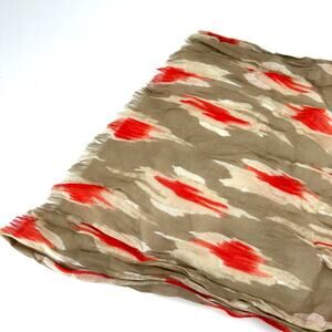 Soft open-weave cotton blend scarf with an ikat-inspired pattern in taupe, coral red, and cream tones. Lightweight and breathable for all-season wear, perfect for layering over casual outfits, sundresses, or workwear. Can be styled as a neck wrap, headscarf, or shawl for travel and festivals. Approximate measurements provided below are flat.