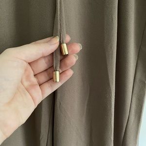 Comfy taupe drawstring pants with gold aglet detail and jogger style cuffs