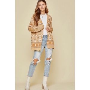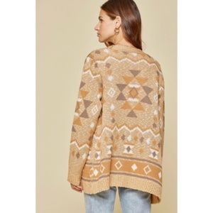 Fun aztec sweater with pattern throughout. This features long sleeves, open front bodice with loose fit.