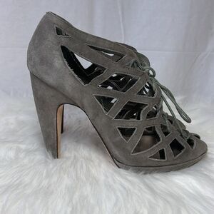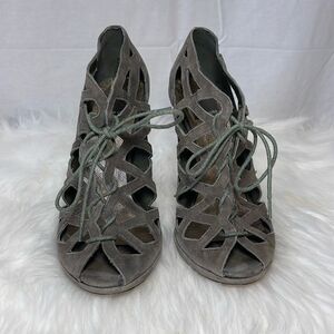 Taupe Grey Suede Platform Lace Up Lattice Detail Heels Sz 9