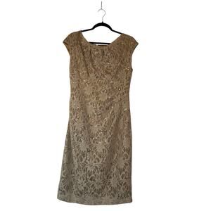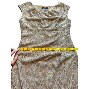 Elegant and timeless, this gorgeious dress features a stunning lace overlay with delicate sequins that shimmer beautifully in the light. Designed with a flattering pin-tucked neckline, this dress is both sophisticated and feminine. The style includes a fully lined interior for comfort, and a hidden back zip closure for a seamless fit. The classic sheath silhouette and cap sleeves make it ideal for weddings, formal events, or special occasions. A perfect choice for the elegant mother of the bride looking for grace and sparkle or for any formal occasion. Disclaimer: Colors and measurements may vary slightly due to differences in lighting, display settings, or AI-generated rendering.