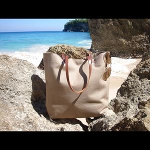 Natural Linen Tote Bag in a neutral taupe color is lightweight and a breeze to carry. Holds a ton of stuff and contains 3 interior slip pockets and an interior zipper pocket. Natural leather straps. This color is being discontinued by our fabric vendor so we are selling our remaining stock .