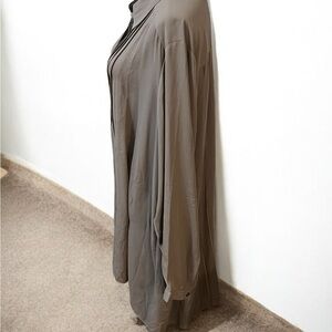This taupe blouse features a notched collar and long sleeves, offering a boxy silhouette with pleated details for a stylish touch. Its button-down design makes it a versatile piece for both casual and business settings.