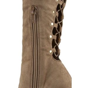Brand new in the box From Lola Shoetique!! Slay in these thigh high boots! Pointed toe, stiletto heel, thigh high construction, nail head details side zipper closure, rear lace-up and a lightly padded insole for comfort. Boot height: Approx 29 inches. Heel height: Approx 4.5 inches. Laces are tucked in on the photos.