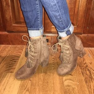 These taupe lace-up booties are not only super cute but they are super comfortable! They feature a lace-up front with tassel laces, side zipper and soft inner lining that makes these comfortable to wear! Heel height: 3.5". Material is man made suede
