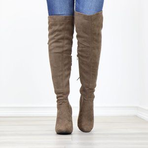 Taupe Suede Thigh High Over The Knee Block High Heel Boots With Lace Up Back