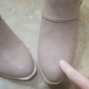 Shoes have never been worn. I bought them on Poshmark brand new and the size didnt fit me. There is a very small and faint mark on top of boot as shown in picture. U have to look for it. I wasnt too concerned when I received them. Hopefully you wont mind either.
