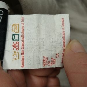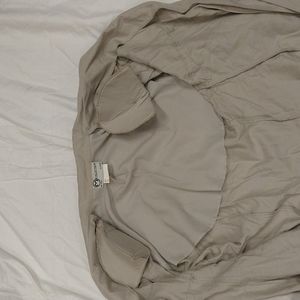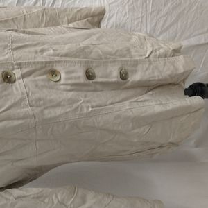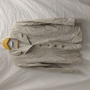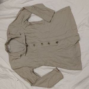 taupe color, buttons down front, shoulder pads, light tweed like material, lightweight, soft, breathable, very comfortable