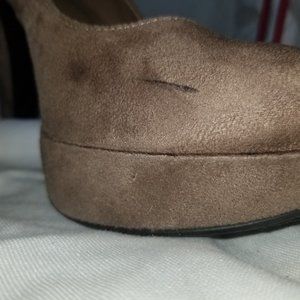 Call It Spring brand heels, dark taupe/mocha/brown/cocoa color (that is more closely reflected in the first photo), velvety material, in the original box. Absolutely no wear on the soles. There are small wear spots on the back of both and inner edge of the right platform - noted in photos. 5" heel height 1" platform height These definitely are not wide, they are more medium to narrow.