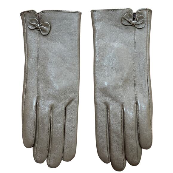 Vintage ladies formal taupe/tan leather gloves size M done in a classic mid century style - faux fur lined - cute bow & top stitch detail at each wrist. These are NEW without tags / never worn. There are pin hole flaws in the leather from a store tag now gone missing - otherwise in excellent condition and so cute!
