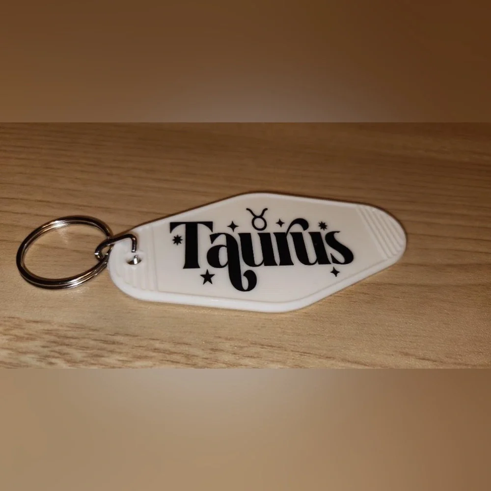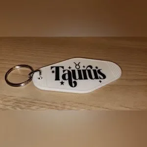 White Taurus keychain with black lettering and design.