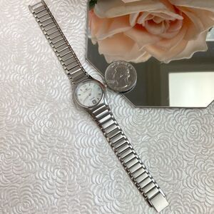 Tavan Swiss quartz stainless steel mother of pearl dial dress watch. Watch features a round stainless steel case and band with mother of pearl dial. The dial has a date indicator at 6 o'clock and is marked, "Tavan, Sapphire." The screw-down case back is marked, "Tavan, All Stainless Steel, Water Resistant 30 Meters, 8003L, 75501." The watch case measures approx. 24mm across excluding crown, and total length of watch with link bracelet band is approx. 7 1/4" (max wrist size of approx. 6 3/4"). No additional links available, but links can be removed to fit a smaller wrist. Watch is in very good condition with a scratch-free crystal and no noticeable wear to case and band. Watch has a new battery, keeping time and date indicator is functioning as it should. Thanks for checking out my closet!