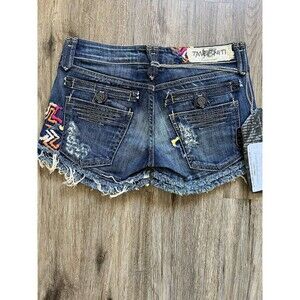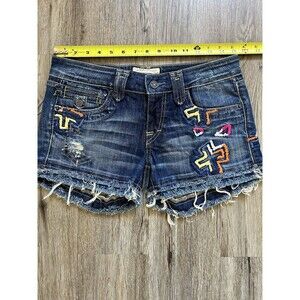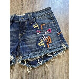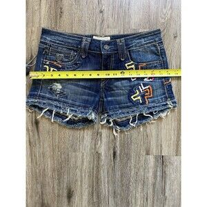 Stylish blue jean shorts. Features colorful embroidery. Frayed hem for a trendy look. Perfect for casual wear.