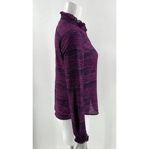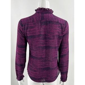 Tavora Top Size 4 Navy Black Purple Printed Sheer Button Up Ruffle Neck Blouse