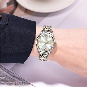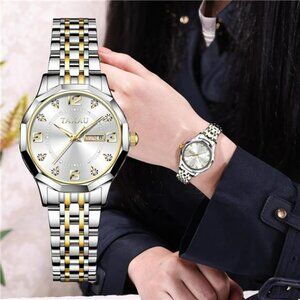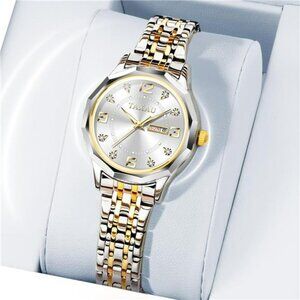【Elegant Watch Design】: This Taxau two tone women's watch with day date showcases a classic watch style with its silver watch dial and gold silver strap, adding a touch of luxury watch. The dial has Arabic numerals,diamond decoration and a calendar window, making the watch easy to read. This lady watch can meet both business occasions and leisure activities.