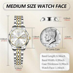【Watch Size】: The women's watch has a case diameter of 1.18 inches (30 millimeters), a thickness of 0.39 inches (10 millimeters), a chain width of 0.59 inches (15 millimeters), a chain length of 8.58 inches (218 millimeters), and a weight of 2.22 ounces (63 grams). If the strap is not suitable, the watch packaging contains a steel strap adjustment tool, which makes it convenient for you to adjust the size according to your wrist.