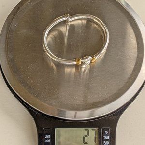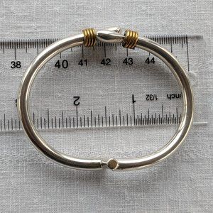 Cuff is solid silver except for brass wire wrapping the ball ends as a golden accent. Clasp mechanism is crisp.