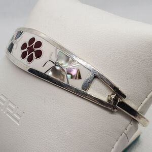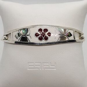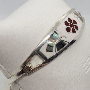 Taxco Mexico silver bracelet with a white and red flower design with abalone shell inlay butterflies.