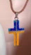 Beautiful cross pendent set with a cobalt blue and yellow orange marbled glass set in a sterling silver. Lovely artisan made cross pieces together like stain glass with a middle seam in sterling. Large bail can accommodate many chains comes with a camel tan brown suede leather cord that can be adjusted to any length.