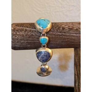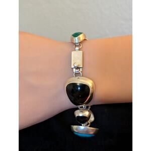 Taxco Signed TZ-17 Mexico 925 Sterling Chunky Twosie Four Stone Link Bracelet. A small and large malachite triangular set, a small and large lapis set, a small and large turquoise set, and a small and large black stone set. Pre-owned, this bracelet is in excellent condition. When considering size, please note the chunky thickness of the bracelet as well as the wrist circumference on the bracelet mandrel along with the length of the bracelet on the measuring board.