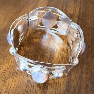 Taxco Sterling Silver Faux Opal Panel Bracelet w Cutouts Scrolls Mexico Vintage