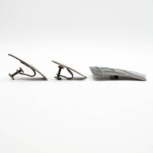 Very good vintage condition with no loss of inlaid stone. There is some irregular patina on earrings that may even out over time or could be polished out. Screw backs seem fairly straight. Safety clasp on brooch is secure and not loose. No noticed blemishes or damage. Normal wear for age. Please see all photos.