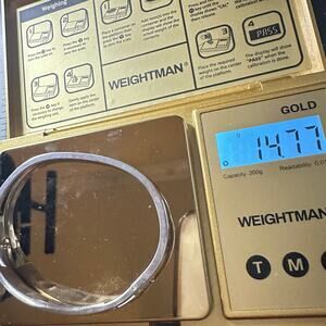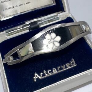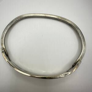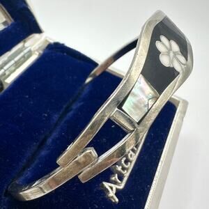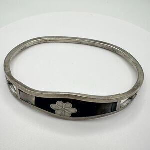 Excellent vintage condition, shows minor tarnishing. Gorgeous upper features genuine black onyx and iridescent abalone inlay with flower accent. Hinge and clasp function perfectly. Inner is faintly stamped with a Taxco hallmark and 925 on opposite. Weight is 14.77 grams. With at base is approximately 0.13" and 0.56" at widest upper point. Please see photos for inner measurements in inches.