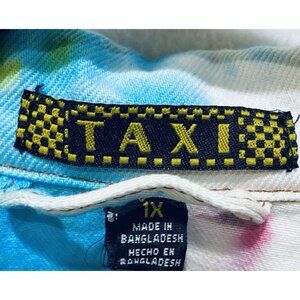 This Taxi Jacket for women in size 1X is a colorful tie-dye trucker jacket perfect for a festival or hippie-inspired look. Made of cotton denim with a machine washable fabric type, this jacket features long sleeves and button closure. It is ideal for occasions such as travel, parties, or casual wear, and comes in a multicolor design with a regular fit. The jacket also includes pockets for added functionality, making it a versatile and stylish addition to any wardrobe.