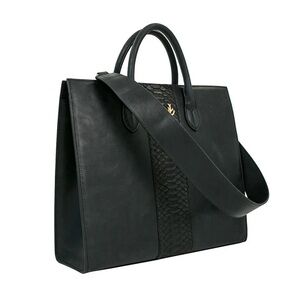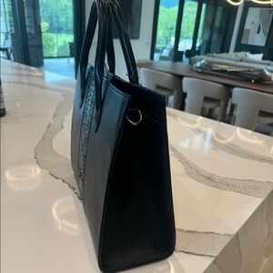 leather and python Amy tote has a leather lining. It’s made from richly textured leather that gets better with age. Interior features a two large open sidewall pockets and cellphone pocket. The top has a magnetic closure. Large enough to hold all your essentials including up to a 13″ laptop. Gold hardware. Protective metal feet.