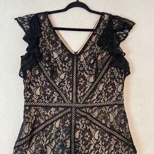 Taylor Black Lace Midi Dress Women's L (12-14) Flutter Sleeves Witchy Fairy Goth Zip up closure in the back V-neck High low hem Midi length Black lace overlay, nude liner whimsical, romantic whimsigoth, feminine, vampiric, mysterious, sexy, date night, evening wear, wedding guest dress, semi formal dress, formal dress *Measurements in photo. Condition: Good pre-owned. No holes, rips or stains. *Size tag has been removed. Please refer to measurements in photo. FAST SHIPPER with same or next day shipping. Please feel free to reach out with any questions.