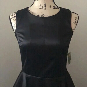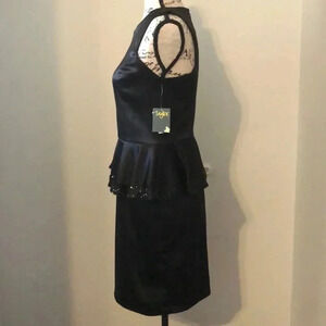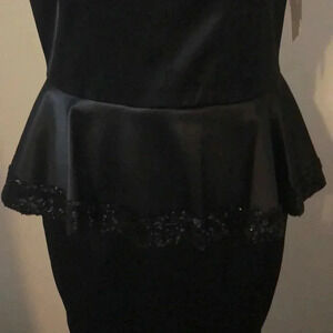 New with tags. Black satin dress with peplum. Sequin details around peplum. Size 4.