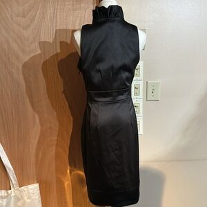 Chic black dress with ruffled neckline. Perfect for elegant occasions. Flattering fit and stylish design.
