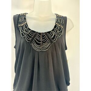 Black sleeveless dress with a blouson-style top and fitted skirt. Silver beaded detailing in a fan pattern around the neckline adds a decorative touch. Soft drape in the bodice area with slight gathering under the collar. No stains rips or tears new with tags