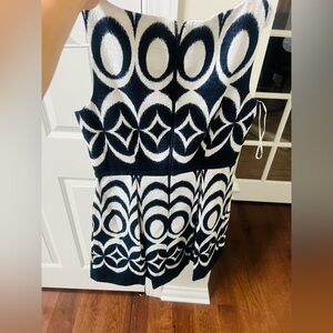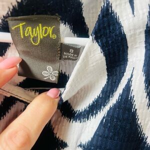 This elegant sleeveless dress by Taylor features a striking blue and white geometric pattern, perfect for a wedding guest or cocktail event. The fit and flare design with a crew neck offers a flattering silhouette, while the structured fabric ensures the dress maintains its sophisticated shape.